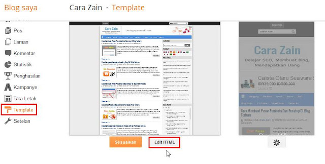 6. Untuk memuatkan kod skrip, pergi ke menu templat dan klik butang Edit HTML